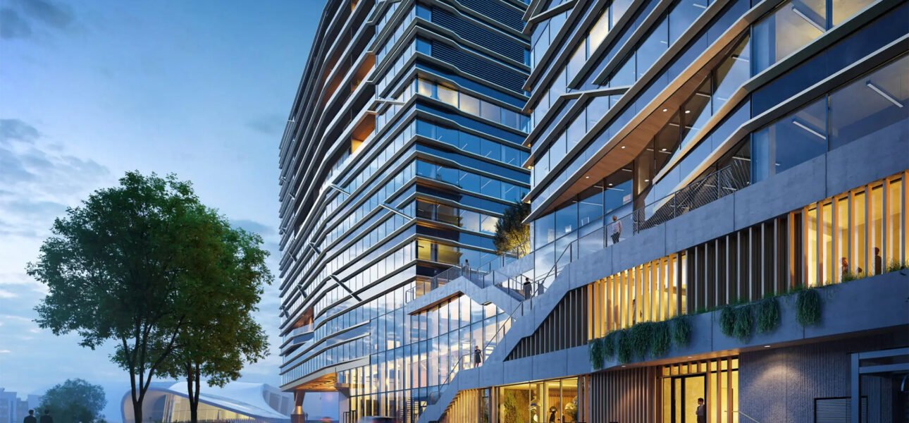- Amenities: Gym, café, daycare, and rooftop event space.